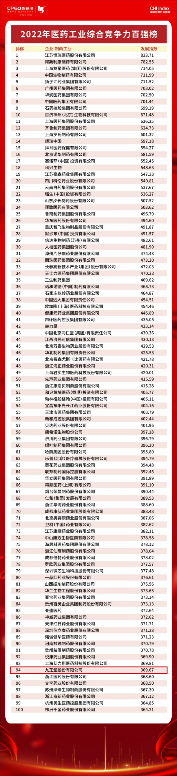 本次重磅发布的医药工业综合竞争力百强榜的选出,是经过以“商业化能力、研发力、产品力、品牌力、盈利力”构建五力模型,对中国境内医药工业企业进行多维度、多指标的全方位评估,以指数形式,直观、客观反映医药工业企业综合竞争力,筛选出医药行业中100名佼佼者入围。入围门槛为364.2,其中入围百强榜的中成药为主的企业共26家。星空集团以发展指数369.67位列第94名。