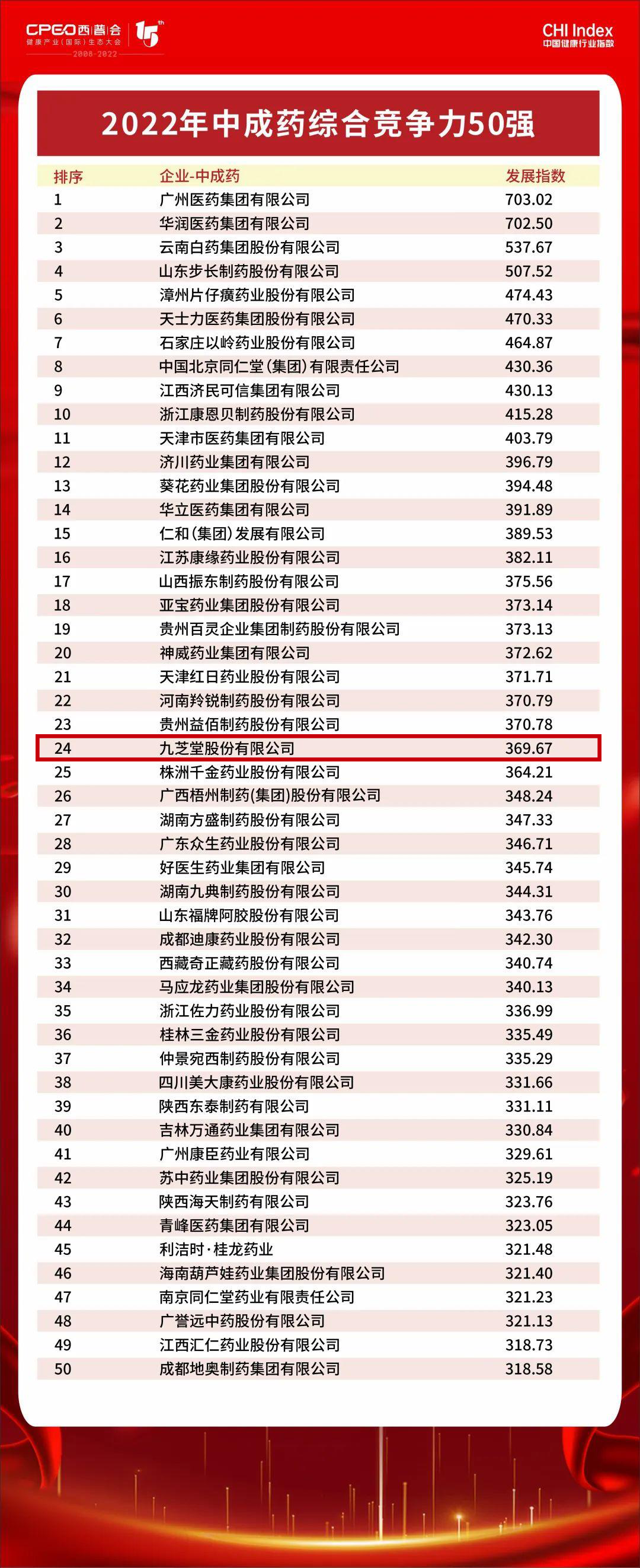 作为中国健康产业规格最高、规模最大、影响力最强的前瞻性产业会议,西普会主办方建立了一套科学、公平、公正、权威的标准化评价模型,在此基础上,推出CHI Index中国健康行业指数。中成药综合竞争力50强榜单是基于CHI Index进行评估,以评价这一领域企业的综合竞争力情况。星空集团作为中医药领域传承创新的老字号典范,入选中成药领域这一重量级榜单,位列第24名。