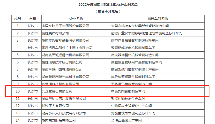 为贯彻落实《湖南省打造国家重要先进制造业高地“十四五”发展规划——湖南省制造强省建设“十四五”发展规划》《湖南省智能制造“十四五”发展规划》,充分发挥智能制造标杆示范引领作用,助力实施智能制造赋能工程,深化智能制造推广应用,湖南省工业和信息化厅组织开展2022年湖南省智能制造标杆企业和标杆车间申报工作。本次认定的湖南省智能制造标杆车间共42家,其中医药企业仅4家。