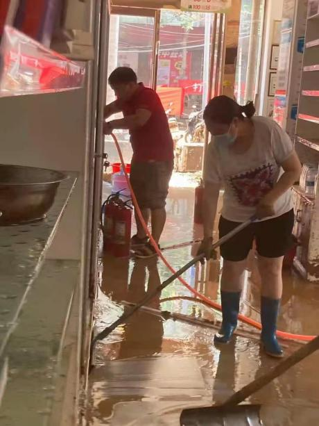 帮助客户脱险复业,哪里需要,我们就卷起袖子一起干。洛阳焦作地区,地区经理带领业务员帮助泡水药店打扫淤泥,恢复经营。